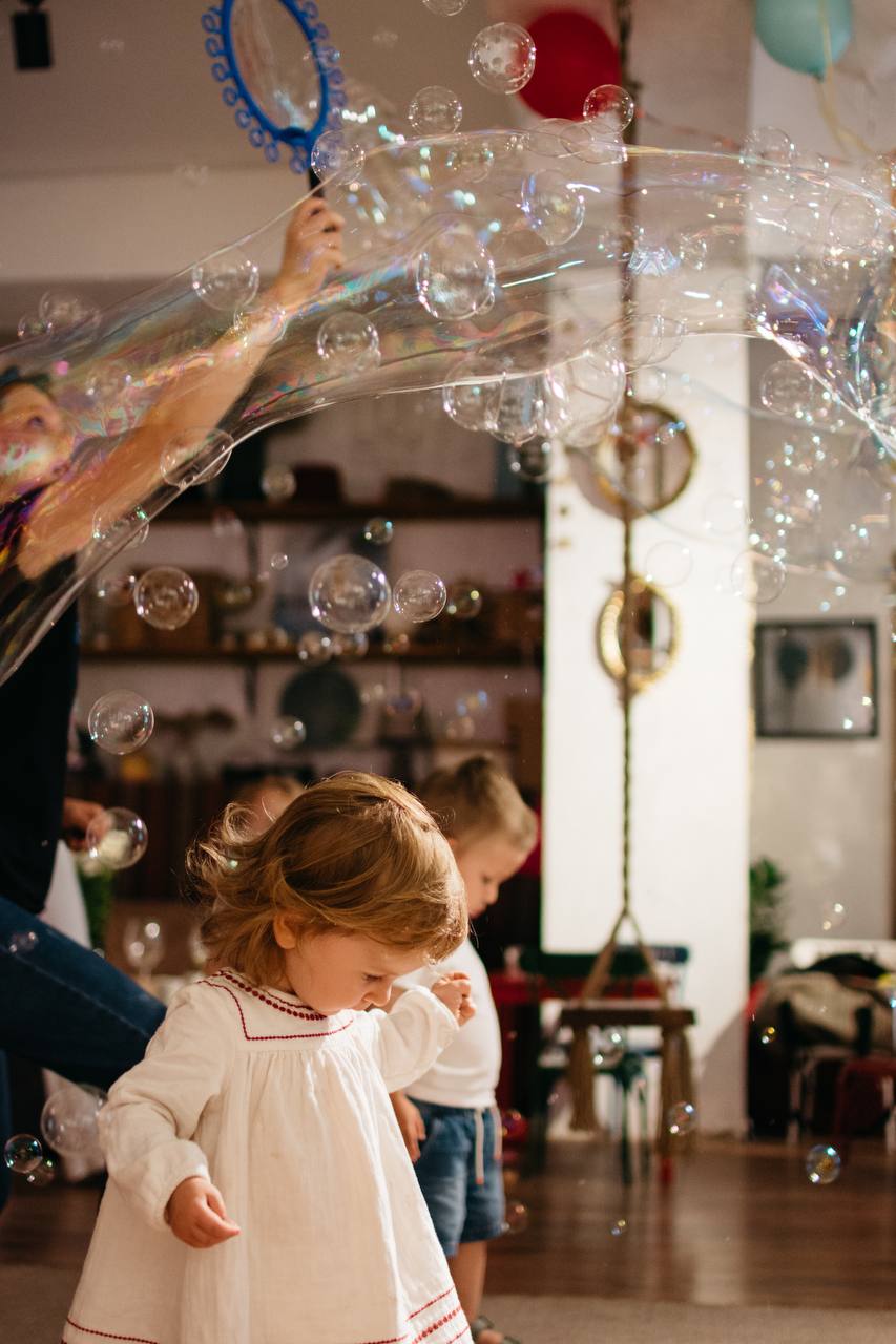 Шоу гигантских мыльных пузырей для детей. Ваш ребенок будет в восторге, если ему на праздник пригласить актеров, владеющих искусством приручения мыльных пузырей. В программе детского праздника помимо интересных игр, конкурсов, розыгрышей, гости станут свидетелями увлекательных трюков с пузырями. Каждый ребенок сможет в буквальном смысле погрузиться в «атмосферу» мыльного пузыря, а также сам сможет выдувать гигантские мыльные пузыри.
